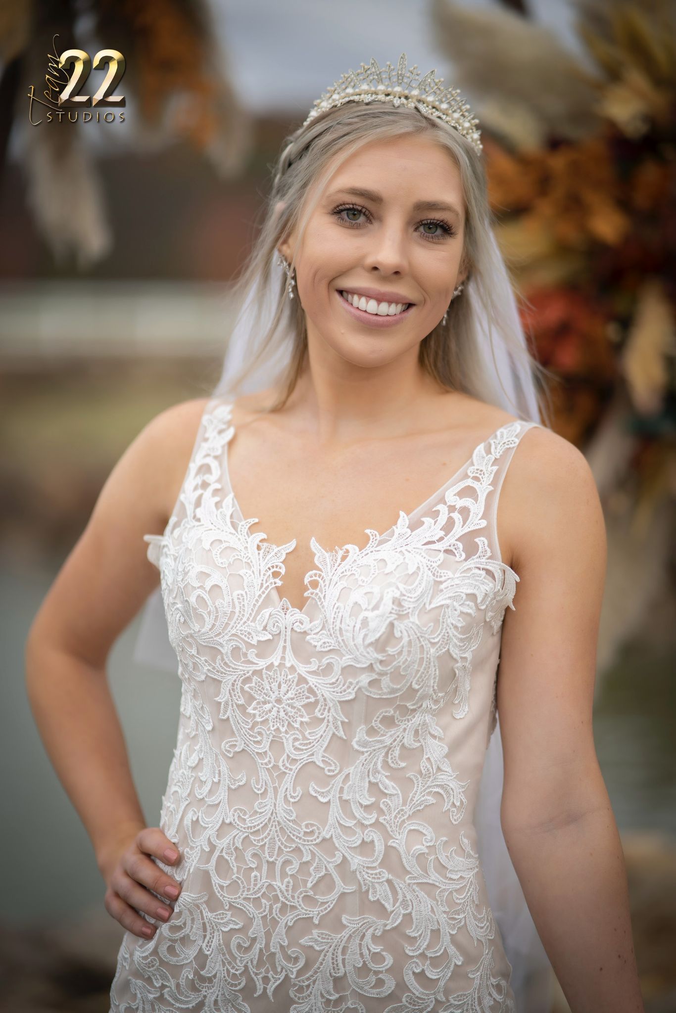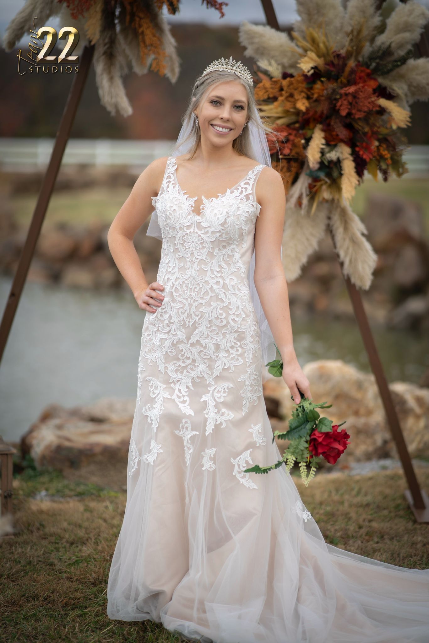 The Ethereal Bloom gown combines timeless elegance with a soft, modern silhouette. Designed with ivory lace appliqué over a nude tulle base, this gown creates a delicate lace-on-skin illusion that flatters the figure beautifully.