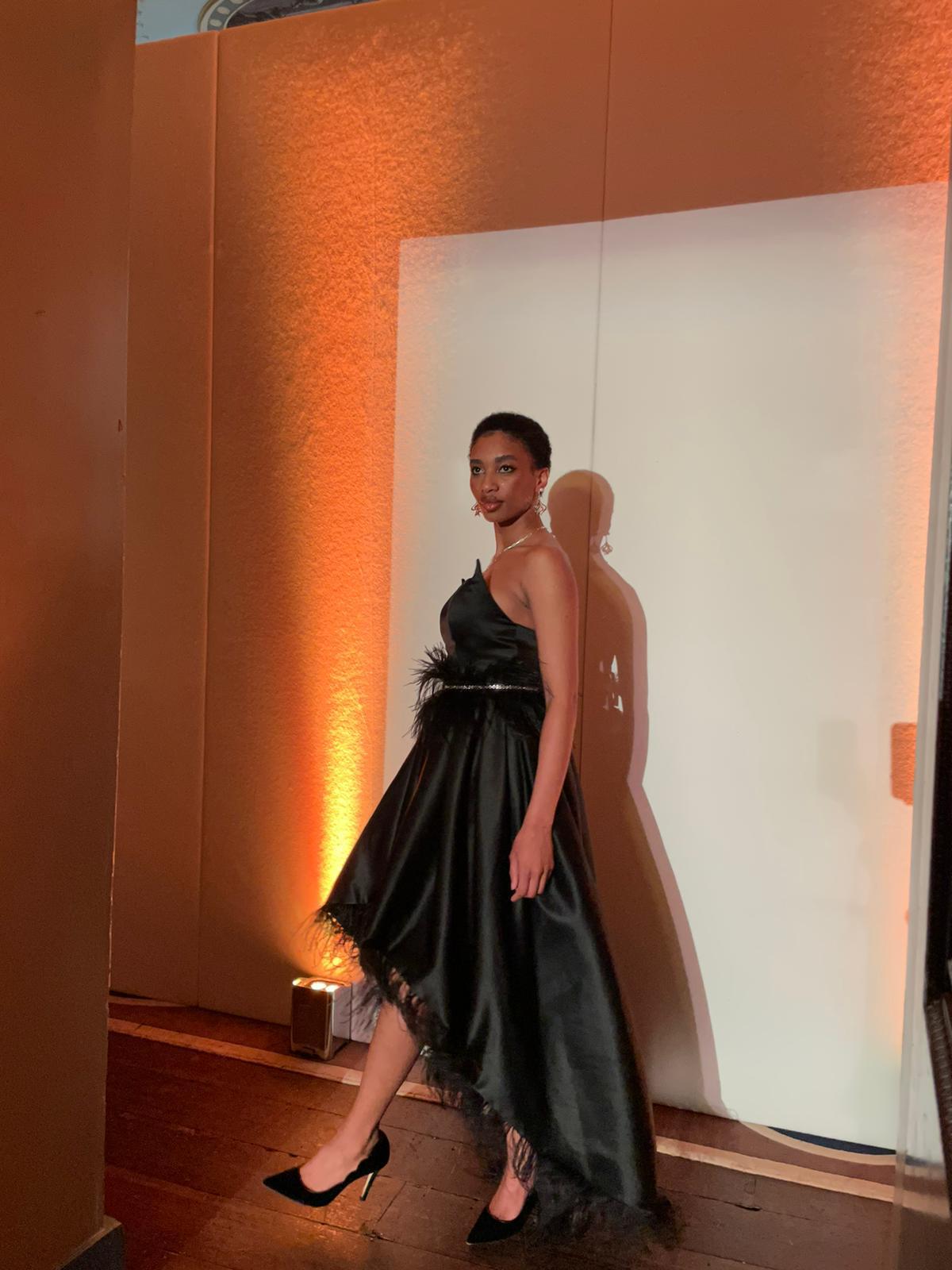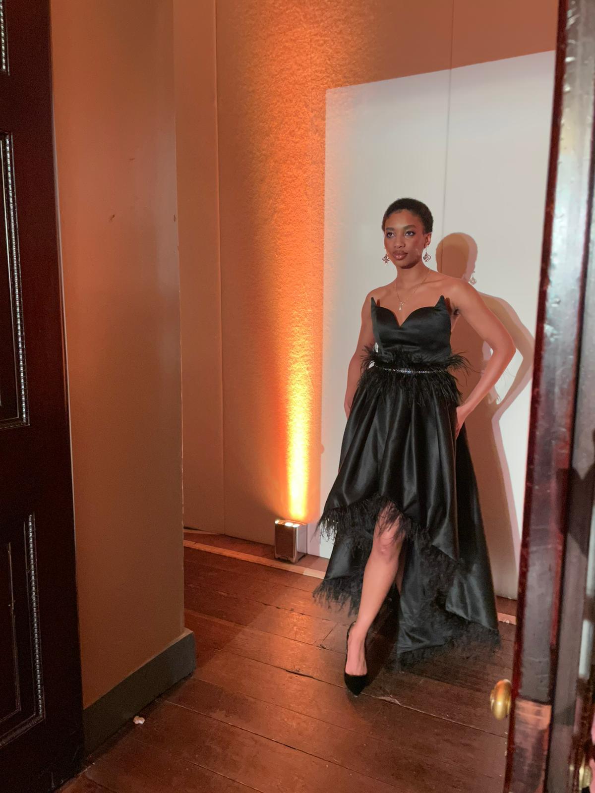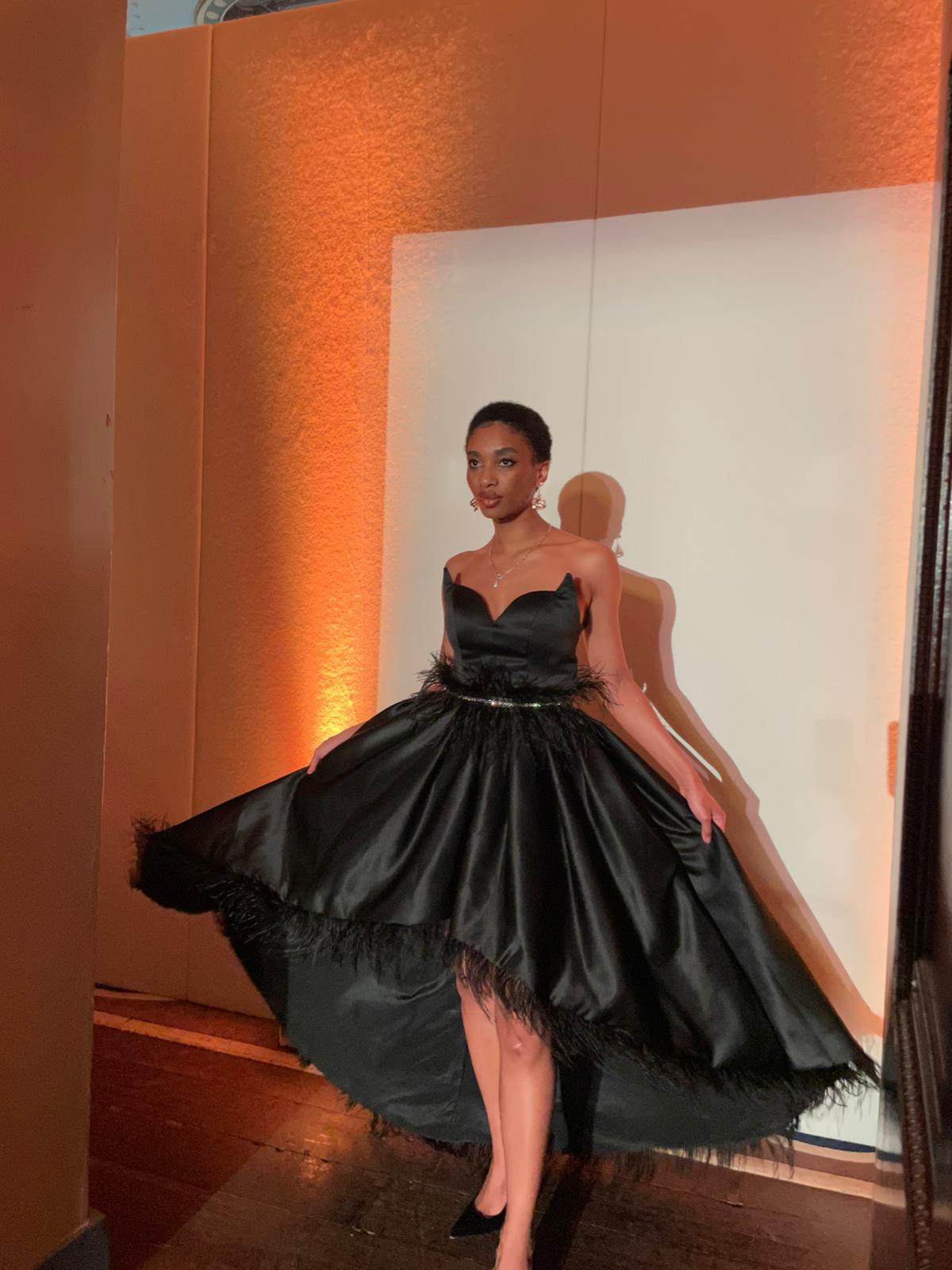 A statement piece designed to captivate. The Midnight Feather Muse dress is crafted from luxurious black satin with a high-low silhouette that elongates the legs and creates graceful movement. The bodice features a structured sweetheart neckline and a lace-up corset back, allowing an adjustable and secure fit tailored to your shape.