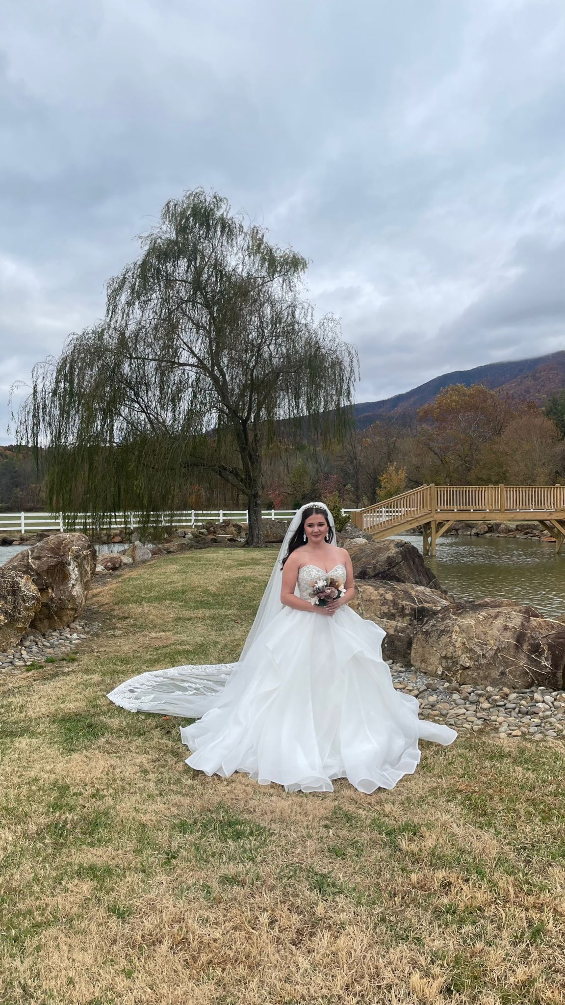 A timeless bridal gown with a flowing layered skirt, structured bodice, and matching veil — crafted for elegance, movement, and unforgettable wedding-day beauty. Complete set $899 (dress & veil).